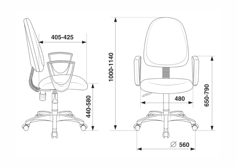 Диаметр колес - 5 см. Высота сиденья - 58 см. Высота с подлокотниками - 79 см. Высота подлокотника - 21 см. Ширина сиденья - 48 см. Глубина сиденья - 42.5 см. Пружинно-винтовой механизм качания спинки. Спинка отдельная от сиденья. Крестовина пластиковая.